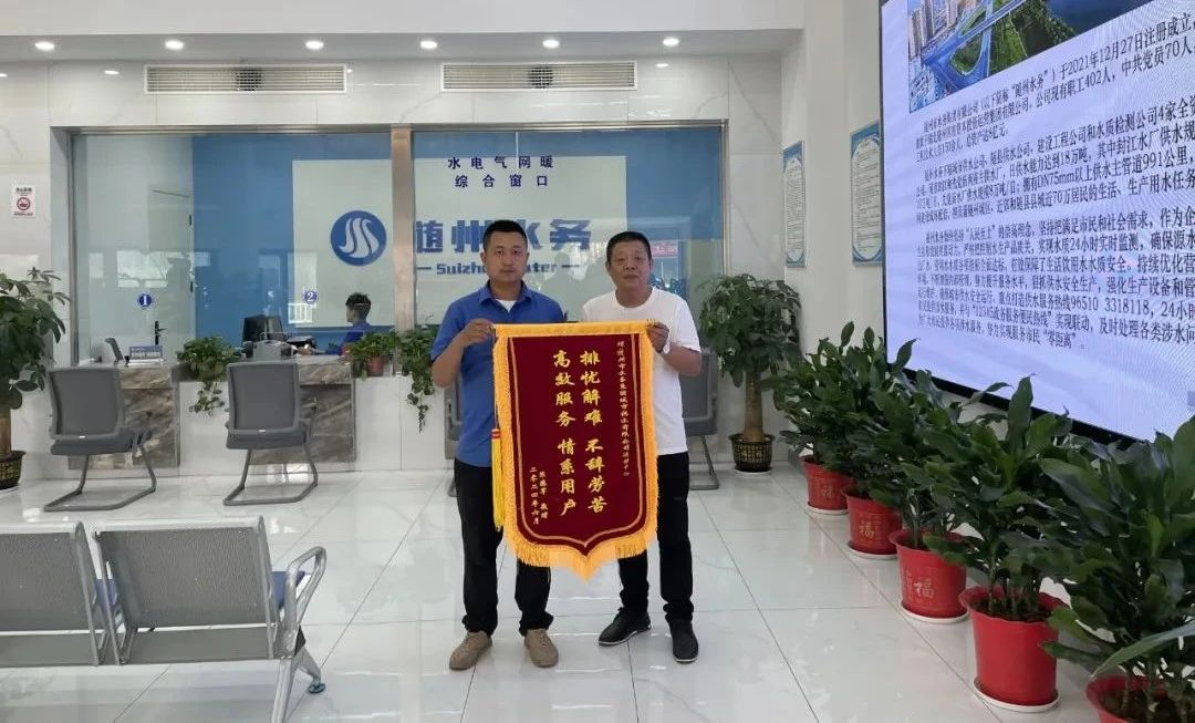 “太感謝你們了,沒(méi)想到這么快就能完工,終于解決了我們的用水難題!”近日,湖北省隨州市地稅小區(qū)用戶將印有“排憂解難不辭辛苦 高效服務(wù)情系用戶”字樣的錦旗送到該市水務(wù)集團(tuán)城市供水有限公司運(yùn)維中心,對(duì)工作人員盡職盡責(zé)、主動(dòng)為民排憂解憂的暖心服務(wù)表示感謝。