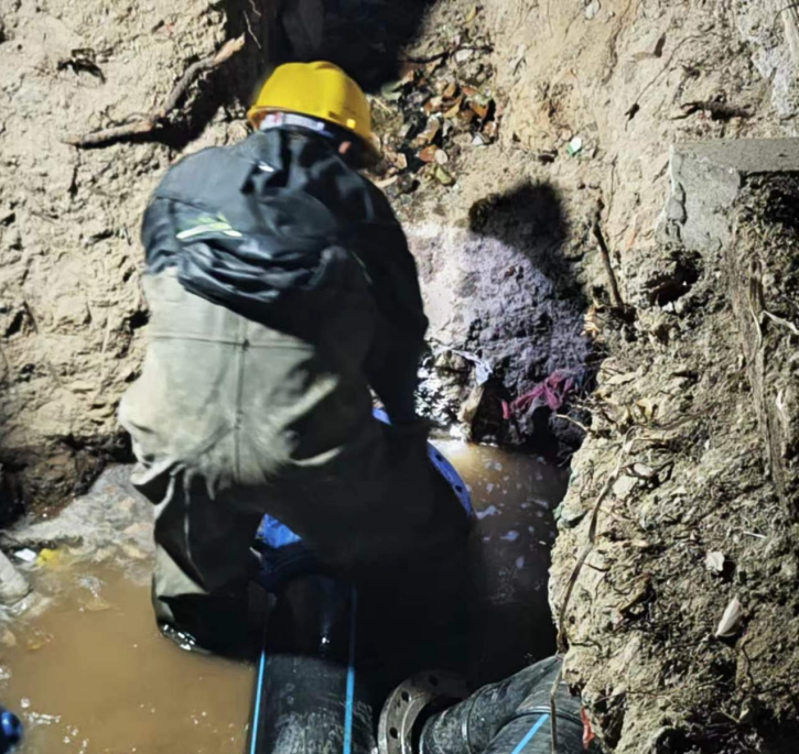 “末端”不末尾,問題不過夜。欣和電子位于高新區(qū)供水管網(wǎng)最末端,周邊聚集了多家24小時連續(xù)生產(chǎn)的企業(yè)。廠區(qū)用水報裝需在DN200管網(wǎng)破口接水,新安裝DN100機械表,既要穿越車流滾滾的主干道,又不能影響“鄰居”們一滴水的正常供應。接到求助后,水務集團建設工程公司立即啟動“高新企業(yè)用水綠色通道”,青年突擊隊成員10分鐘集結(jié)完畢,技術(shù)骨干連夜踏勘現(xiàn)場。