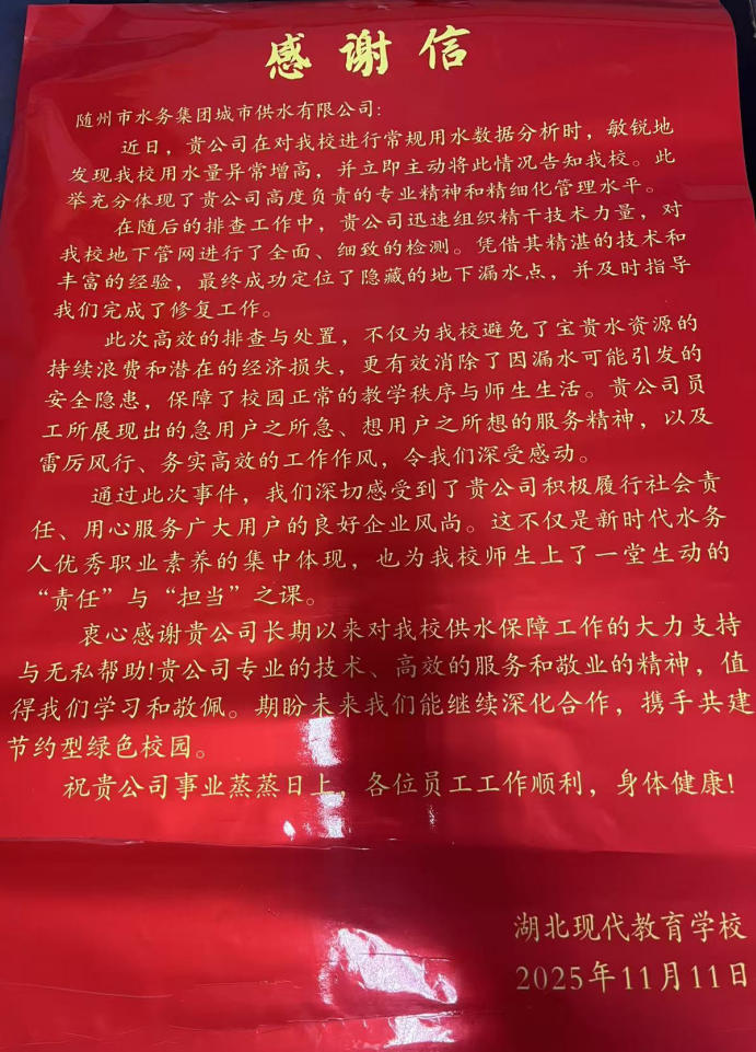 一面鐫刻著“明察秋毫堵漏點,傾心服務(wù)暖師生”的鮮紅錦旗,隨同滿載深情的感謝信,被湖北現(xiàn)代教育學(xué)校負責(zé)人鄭重送到隨州市水務(wù)集團城市供水公司。紙短情長,字里行間飽含對公司快速解決校園供水困境的誠摯謝意。